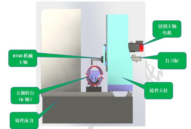 切割主軸;采用電機帶動BT40機械主軸連續(xù)旋轉(zhuǎn),轉(zhuǎn)速3000rpm/min,配有自動打刀缸,主軸上方裝有打刀按鈕,更換不同型號鋸片時直接手動切換即可,無需在設(shè)備上更換,安全、省力。